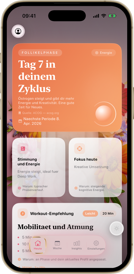 Mahlzeiten, Workouts und Wellness-Tipps — täglich automatisch generiert für deine aktuelle Zyklusphase.