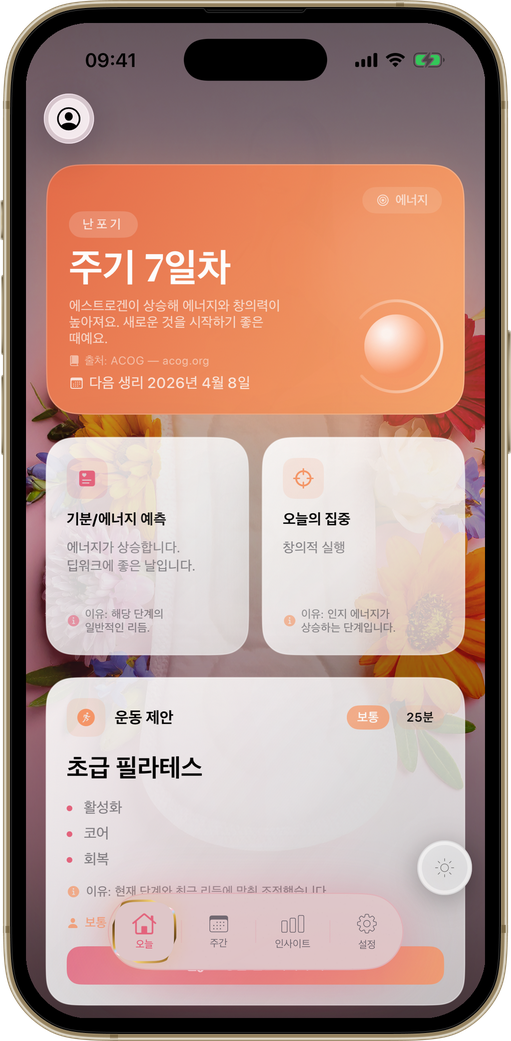 고유한 주기 패턴과 에너지 수준에 맞춰 매일 개인화된 가이드를 제공합니다.